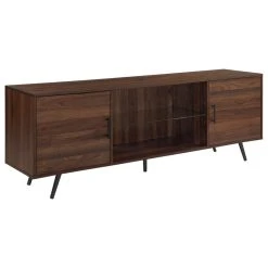 Take your living room to the next level with this stylish 70-inch TV stand. Made with metal tapered legs, sleek metal handles, and a center glass shelf for a mid century modern appearance. This high-grade MDF entertainment center creates additional storage space in your home for media, electronics, accessories, books, or decor. Use as a TV stand in your living room, a storage cabinet in your bedroom, or a buffet in your kitchen or dining room. Including two side cabinets for closed storage space and center open shelving. Can accomodate up to a 75-inch TV.
