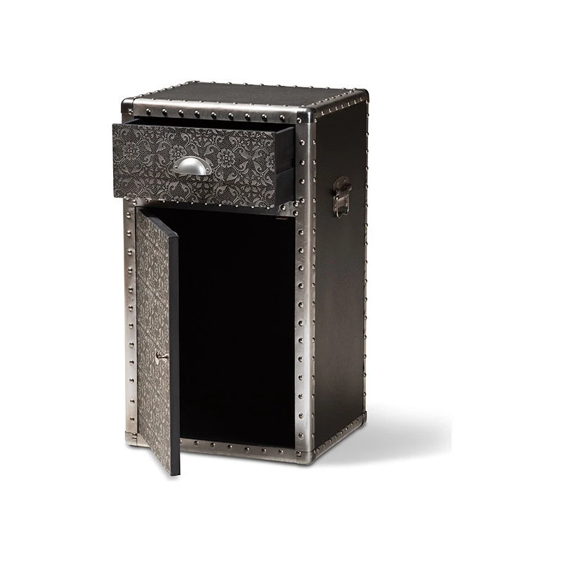 Baxton Studio Cosette Vintage Industrial Silver Metal Floral Accent CabinetRefresh your decor scheme with the charming, industrial-inspired Cosette cabinet. Constructed from MDF wood and silver metal, the Cosette is fitted with one drawer and one concealed compartment, behind a door, to keep items organized and out of sight. The drawer face and door face each display an intricate floral embossed pattern reminiscent of Spanish tile motifs. Inspired by both traditional handicrafts and industrial design, the Cosette features silver metal handles and rivet detailing along its edges. Use this cabinet as an accent piece in the foyer, living room, or bedroom. The Cosette cabinet is made in China and will arrive fully assembled.