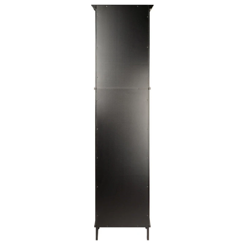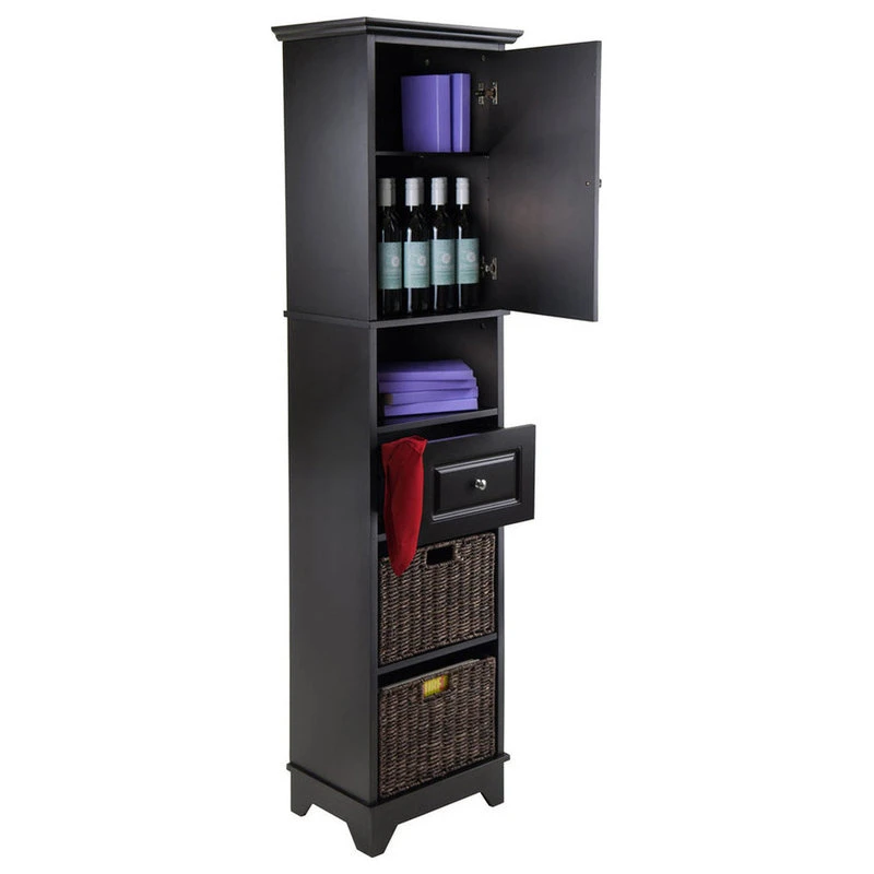 The elegant Wyatt Curio Cabinet is stylish with a functional design, making this storage shelf perfect anywhere in the home. This piece has plenty of storage space for books, art, photos and more. Top section has a wood door and one adjustable shelf which opens to a storage size 14.1″W x 11.1″D x 22.9″H. Bottom section has a 2-section storage and come with two foldable baskets. A middle section has an open storage section of 14.1″W x 11.6″D x 8.6″H and a drawer with inside dimension of 12.8″W x 8.9″D x 5.9″H. Overall assembled size is 18.1″W x 12.9″D x 70.8″H. Corn husk foldable basket opens to 13.75″W x 10.4″D x 9.4″H, the shelf section for baskets is 14.1″W x 11.4″D x 10.9″H. The shelf for baskets section is fixed. Construction with MDF in black finish. Assembly required.Features