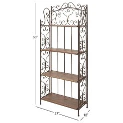 68″ Organic Inspired Rustic Iron Four Shelf Baker’s Rack, wooden shelves, scrolled top and sides, vertical grill back, rectangular base, footed