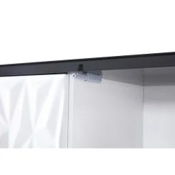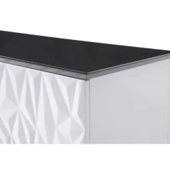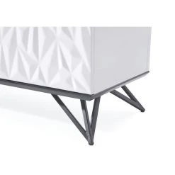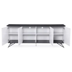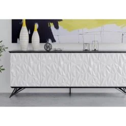 The two-toned Vortice Sideboard stands out with a compelling design and impeccable construction. The white high gloss lacquer middle features a stunning geometric multi-dimensional pattern. This is sandwiched between a black lacquer beveled top and matte black angled steel legs at the base. The four simple push-to-open doors reveal a massive space with multiple adjustable height shelves and two holes for wire management to suit all your storage needs in any room in the house. The Vortice Sideboard is a piece of art in itself that will transform your home into a modern gallery. The suggested weight capacity is 220lbs.